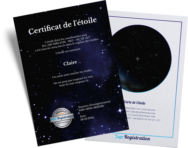 Chez Registre des Étoiles, nous vous offrons l'opportunité d'immortaliser le nom de quelqu'un dans l'univers. Notre registre stellaire, opérant à l'international, garantit que chaque étoile nommée est enregistrée pour la postérité, en faisant un cadeau parfait qui dure au-delà d'une vie. Si vous achetez une étoile chez nous, chaque enregistrement est accompagné d'un certificat qui confirme le nouveau nom de l'étoile et ses coordonnées dans le ciel.